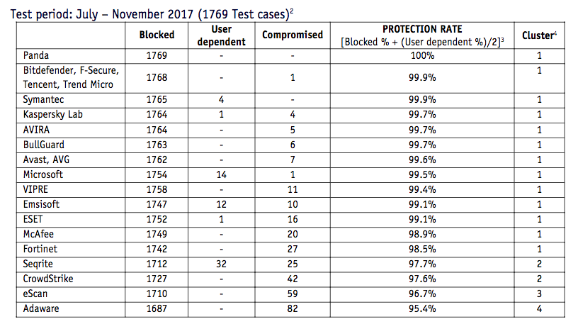 AV Comparatives zoekt voor deze tests op internet naar schadelijke sites die malware op je pc proberen te zetten. In de periode van juli tot en met november 2017 waren dit 1769 kwaadaardige sites die malware aanboden via drive-by downloads. Gekeken werd hoeveel bedreigingen geblokkeerd werden door de virusscanners in deze periode. Hieronder de resultaten.