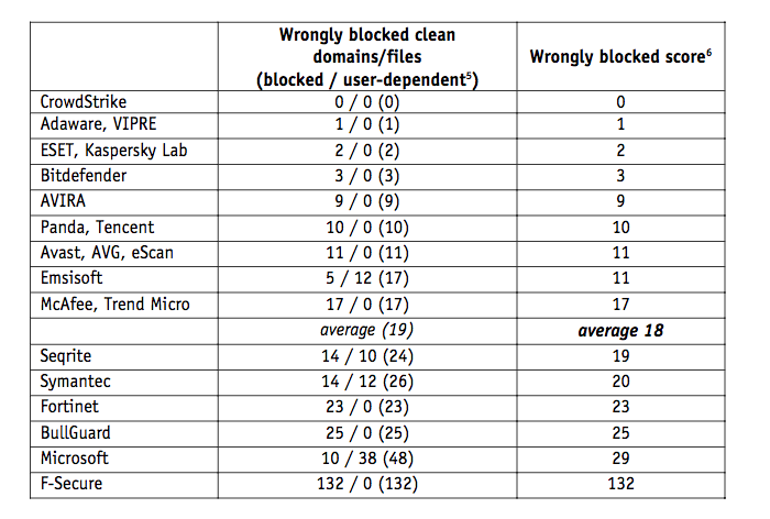 F-Secure verknalde zijn adequate bescherming door de 132 vals positieven. Ook Symantec en Windows Defender boden goede bescherming maar waren slechter dan gemiddeld bij de vals positieven. Bovendien vroege beide virusscanners te vaak aan gebruikers wat ze wilden doen met een virus.