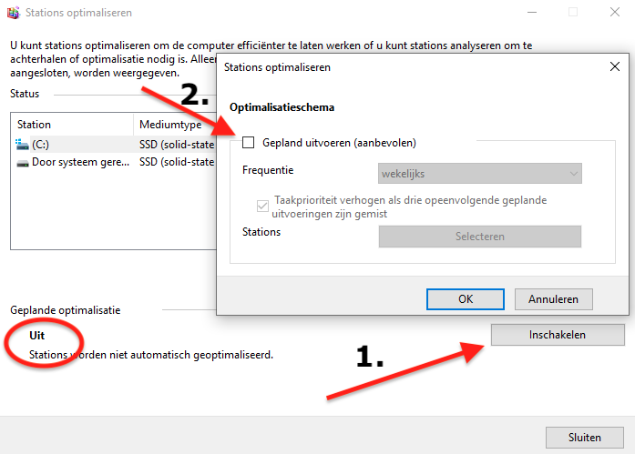 5. Indien niet ingeschakeld (Uit staat er dan in plaats van Ingeschakeld) dan klik je 1. op Inschakelen en zet je 2. een vinkje bij Gepland uitvoeren en klik je OK