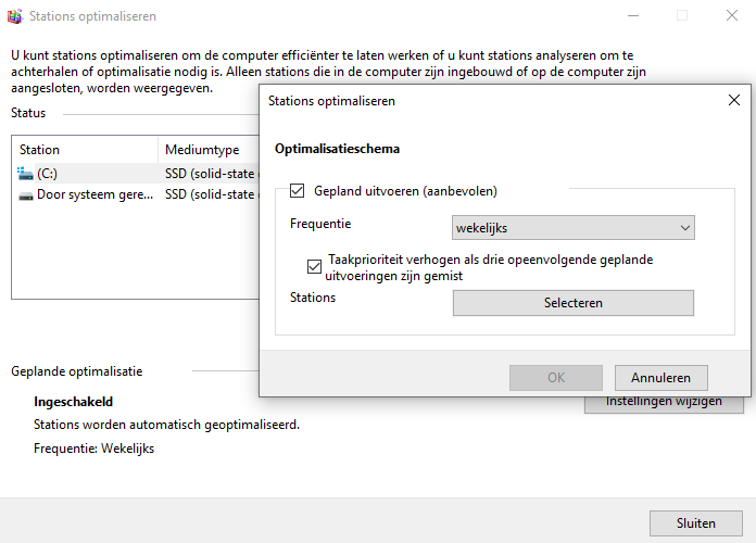 Als het vinkje er staat dan wordt je SSD of harde schijf schijf wekelijks automatisch geoptimaliseerd en in goede conditie gehouden. Daar heb je geen extra programma's voor nodig.