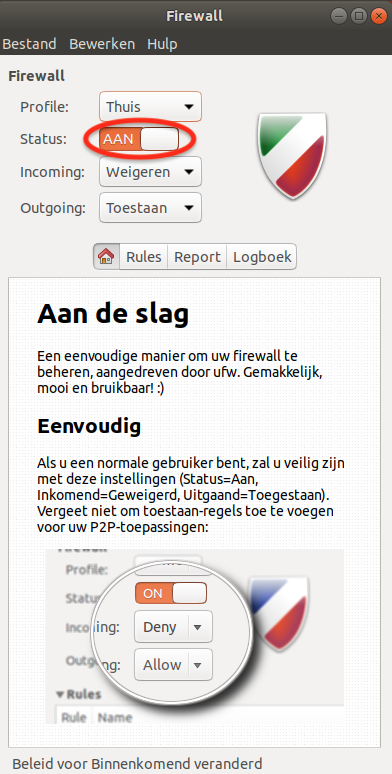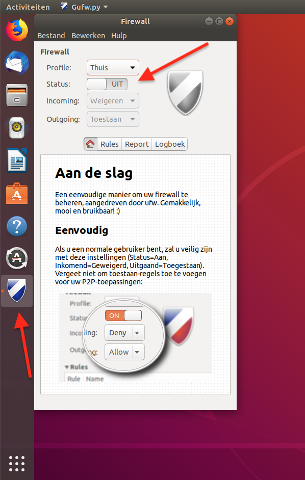 6. Gufw opent: zet de schakelaar bij Status van Uit op Aan
