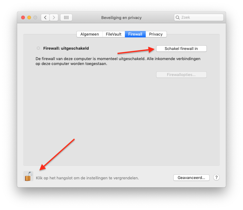 (in macOS 10.15 is dit Beveiliging en privacy | Firewall)