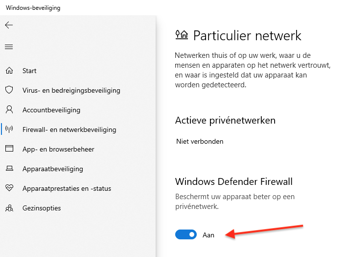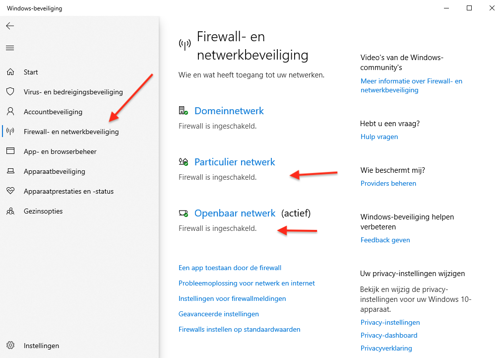 2. In Windows-beveiliging ga je naar Firewall- en netwerkbeveiliging en je kijkt voor alle soorten netwerken of de firewall is ingeschakeld (particulier is je thuisnetwerk bijvoorbeeld en openbaar is buitenshuis)