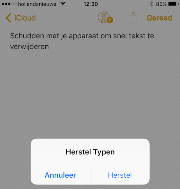 Schud met je iPhone of iPad nadat je tekst getypt hebt en je krijgt de mogelijkheid tot 'Herstel typen', dat wil zeggen: verwijder de tekst. Als je toch spijt hebt van het verwijderen kun je weer schudden met je iPhone of iPad, waarna je de optie 'Opnieuw typen' krijgt dat de tekst weer terugplaatst. Even schudden dus als je typt. Het werkt in elke app op je iPhone of iPad.
