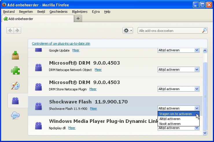 Ook kun je in Firefox en Google Chrome ervoor kiezen om plugins zoals bijvoorbeeld Java, Silverlight en Flash alleen te activeren als je dat zelf wilt. Dit heet ook wel click-to-play (klikken om af te spelen). Dit stel je zo in: