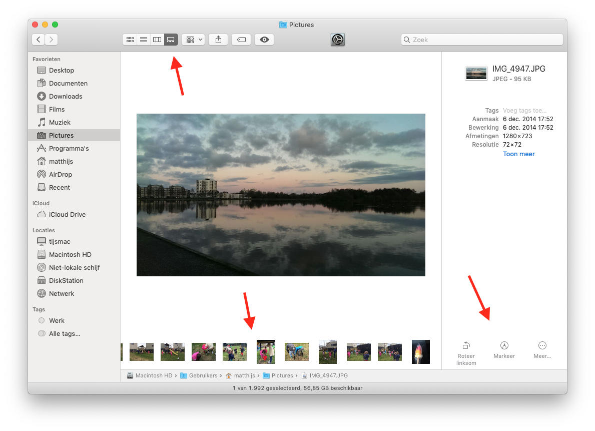 In Finder (de bestandsverkenner op de Mac) is bovenaan een nieuwe galerij-weergave beschikbaar zodat je snel afbeeldingen kunt vinden. Ook kun je nu direct vanuit Finder (zonder de Voorvertoning-app te openen) rechtsonder snelle bewerkingen uitvoeren, zoals roteren, markeren en pdf maken. Zie de afbeelding hieronder (klik voor groter).