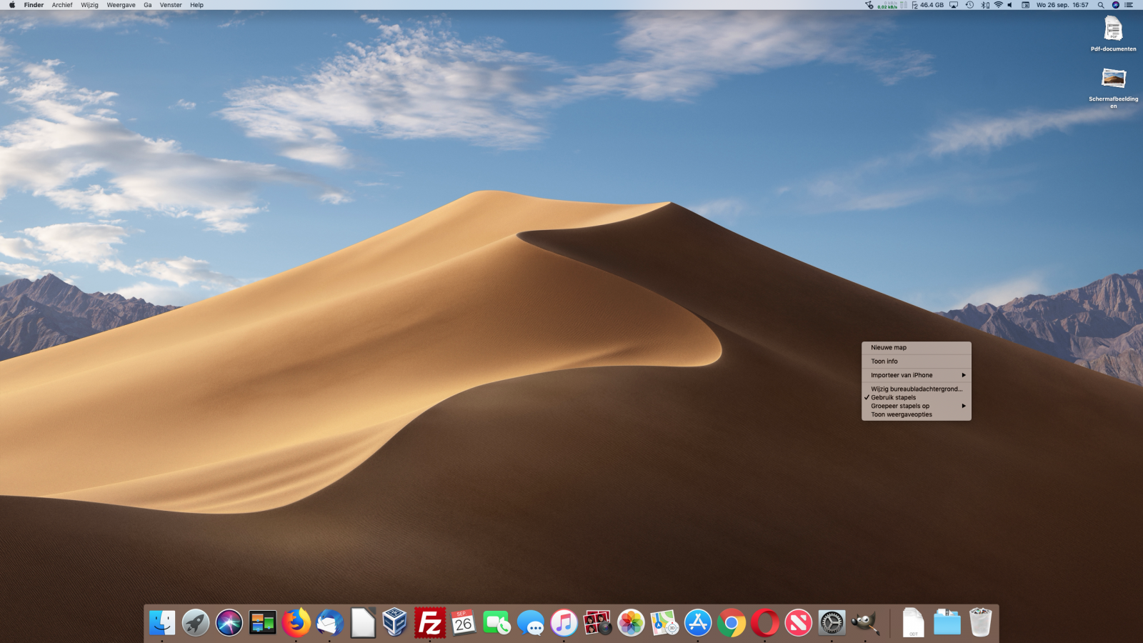 Ook kun je een dynamische achtergrond voor je bureaublad instellen die meeverandert met het tijdstip van de dag (Systeemvoorkeuren | Bureaublad en schermbeveiliging | Mojave - kies Dynamisch. Je ziet dan de Mojave woestijn licht en donker worden in de loop van de dag. Een mooi effect.