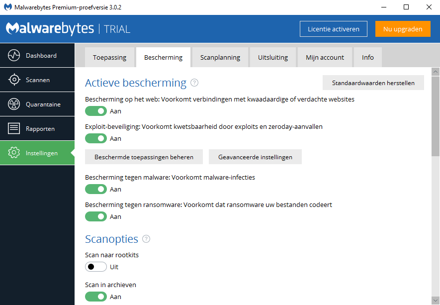 De realtime bescherming en anti-ransomware, anti-exploit en browserbeveiliging zijn echter voorbehouden aan de betaalde premium-versie - die rond de 40 euro per jaar gaat kosten, maar die je de eerste twee weken gratis kunt uitproberen. Daarna blijft alleen de on demand scan-functionaliteit over en wordt de continue bescherming uitgeschakeld, tenzij je een betaalde licentie aanschaft. De gratis versie van Malwarebytes 3 is dus net als MBAM 2 een on demand malware-scanner die geen realtime bescherming biedt.