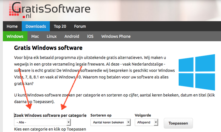 3. Windows, Mac, Linux, Android, iOS en Windows Phone pagina: per besturingssysteem zoeken per categorie