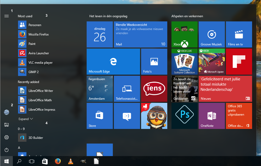 Rechts zitten de meestgebruikte (3) en onlangs toegevoegde applicaties. Ook nieuw is dat je hier gelijk kunt scrollen door de alfabetische lijst van programma's (4), zonder dat je eerst naar alle applicaties hoeft te gaan.