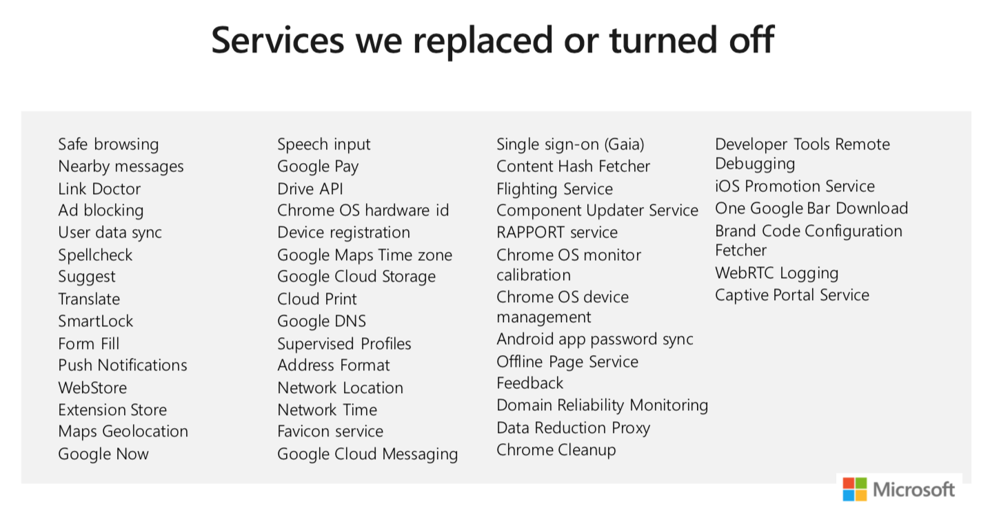 Omdat Chromium in eerste instantie door Google wordt gemaakt voor zijn Chrome browser zitten er ook veel Google-services ingebakken. Het project is echter ook open source dus iedereen mag de broncode van Chromium naar eigen wens aanpassen. En dat doet Microsoft dan ook: het bedrijf sloopt vakkundig een hele waslijst aan Google (phone home) services uit Chromium voordat het Edge daarop baseert: