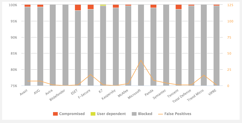 Dan de vals positieven: de onterechte meldingen van een virus (terwijl een bestand onschuldig is). Bitdefender en Kaspersky waren hier foutloos met nul onterechte virusmeldingen. Avira gaf één keer vals alarm, McAfee drie keer, Symantec vier keer en AVG en Avast zeven keer. TrendMicro en F-Secure deden het minder goed met respectievelijk 16 en 17 vals positieven. Windows Defender van Microsoft deed het hier niet goed met 39 vals positieven. Dat doet de foutloze bescherming van Microsofts virusscanner enigszins teniet.