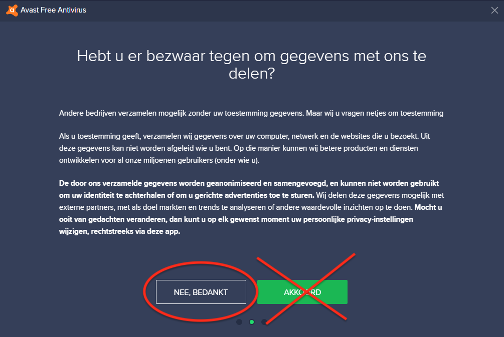 Als je dus een venster te zien krijgt met vragen hierover van Avast (of AVG, dat ook van Avast is), lees dit dan goed en kies ervoor om geen toestemming te geven!