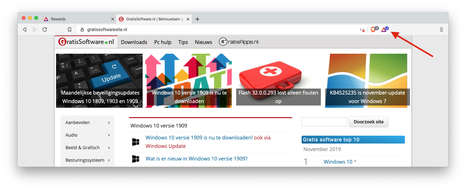 Zo kun je dus websites steunen via Brave Rewards door te surfen met Brave. Websites moeten zich dan wel aangemeld hebben en geverifieerd zijn door Brave. Dit kun je zien aan de gekleurde driehoek met een paars/wit vinkje aan het einde van de adresbalk (klik op afbeelding voor groter):