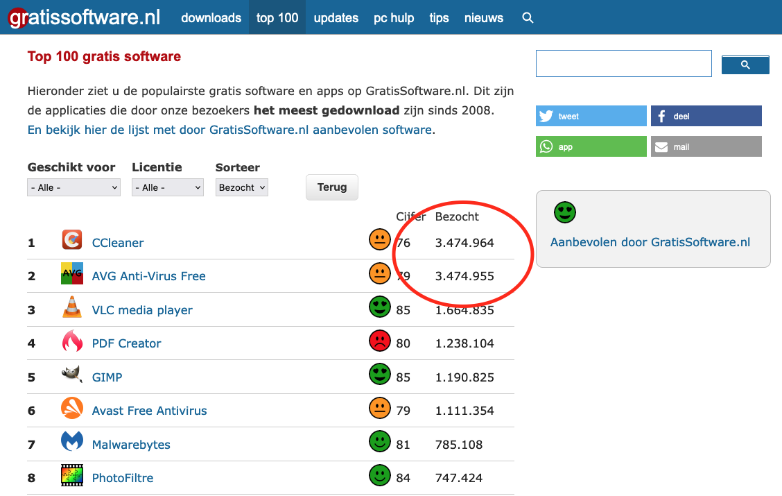 Sinds 2008 houden wij statistieken bij van de meestbezochte pagina's van gratis software. Virusscanner AVG stond daarbij dus al vijftien jaar op de eerste plaats. AVG was vooral in de eerste jaren veruit de populairste gratis software op onze website. Daarna kwam schoonmaker CCleaner ook sterk opzetten.