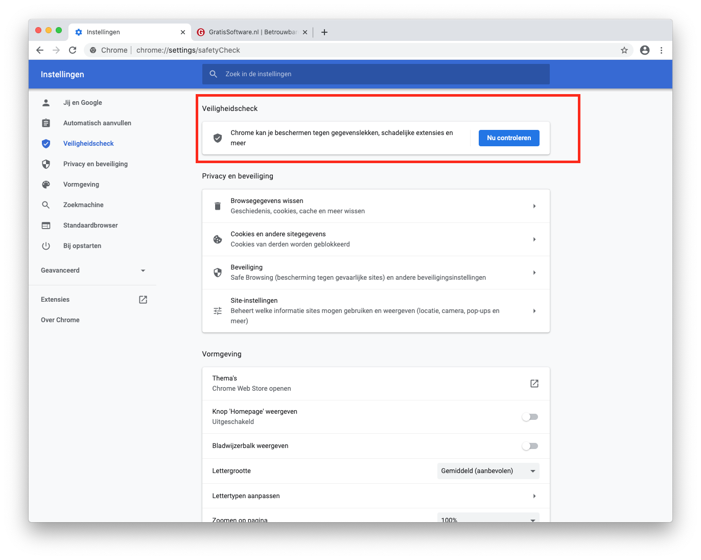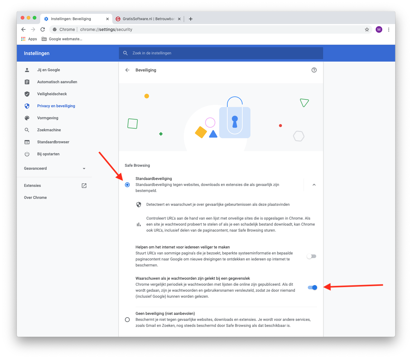 Bij Beveiliging kun je nu Safe Browsing aanzetten op Standaardbeveiliging (bescherming tegen gevaarlijke websites, downloads en extensies) of Geen beveiliging. Binnenkort moet hier ook nog 'Verbeterde beveiliging' aan worden toegevoegd.