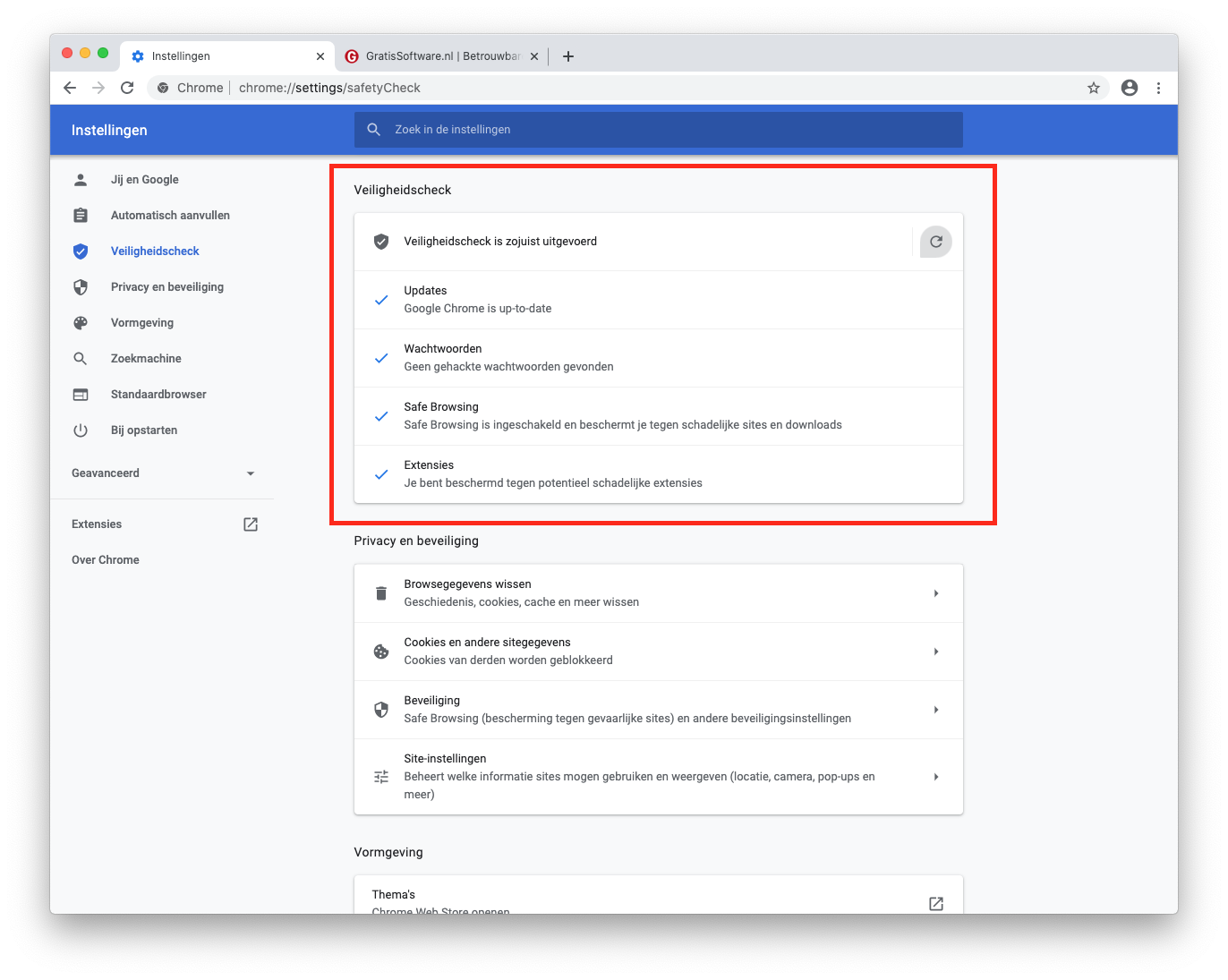 Nadat je op Nu controleren hebt geklikt gaat Chrome kijken of je browser up-to-date is, of je wachtwoorden ooit gehackt zijn, of safe browsing aanstaat en of je schadelijke extensies hebt gedownload:
