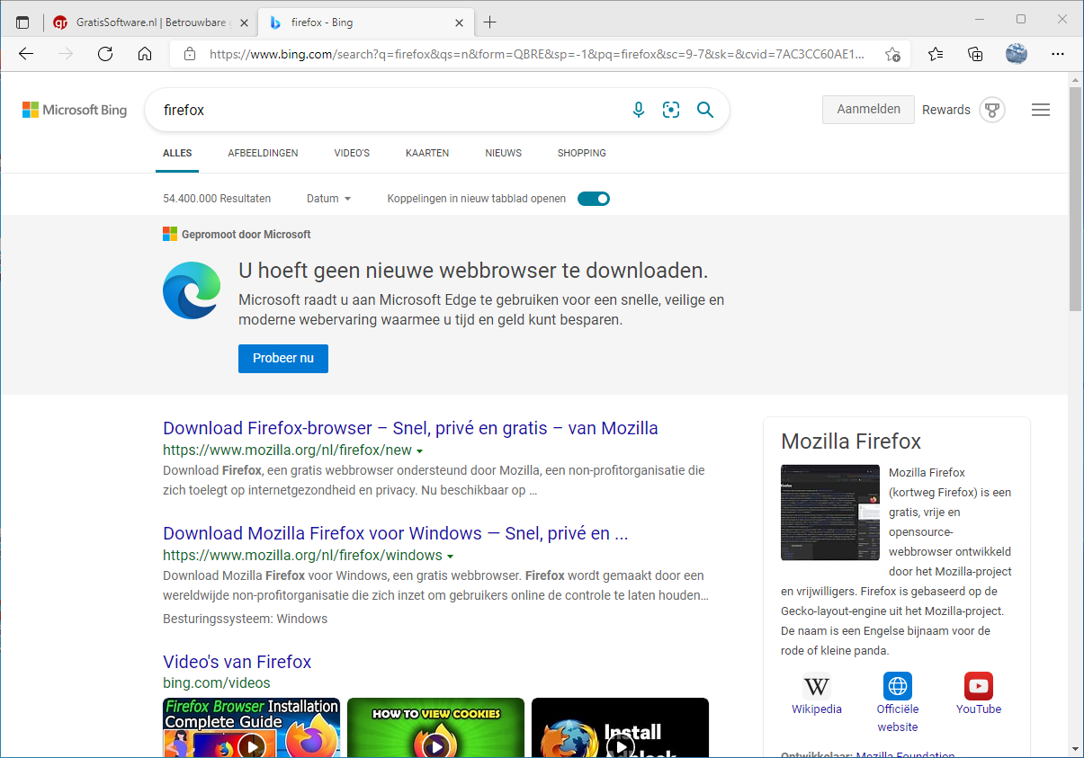 Toch probeert Microsoft mensen te beïnvloeden om niet andere browsers zoals Chrome en Firefox te downloaden. Als je Windows 10 of 11 (opnieuw) installeert en dan met Edge zoekt via Microsofts zoekmachine Bing om Chrome of Firefox te downloaden krijg je deze waarschuwingen te zien: