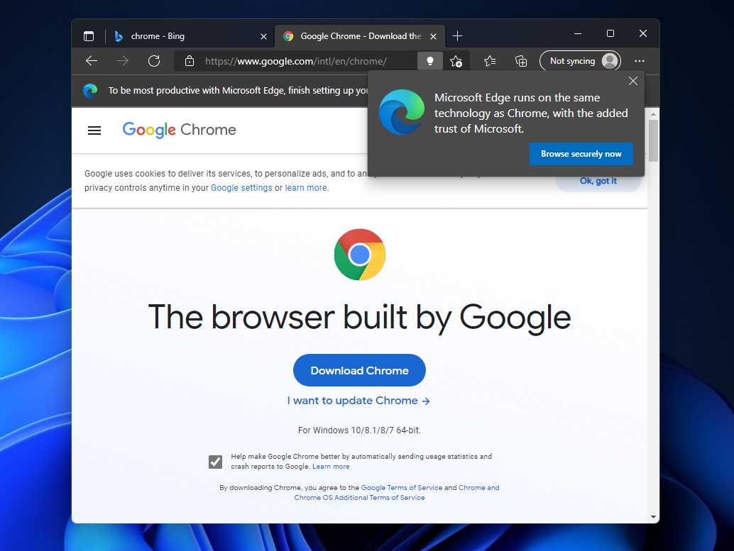 En Microsoft gaat zelfs verder. Windows Latest kreeg popup-meldingen van Edge te zien op de downloadpagina voor Chrome: