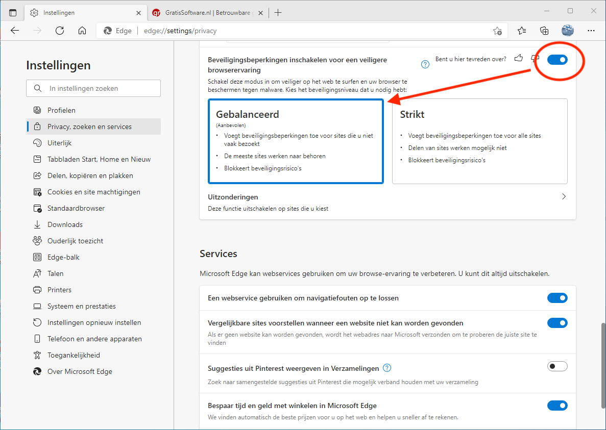 Een eindje onder het kopje Beveiliging vind je dan het item Beveiligingsbeperkingen inschakelen voor een veiligere browserervaring. De schakelaar hierachter zet je aan.