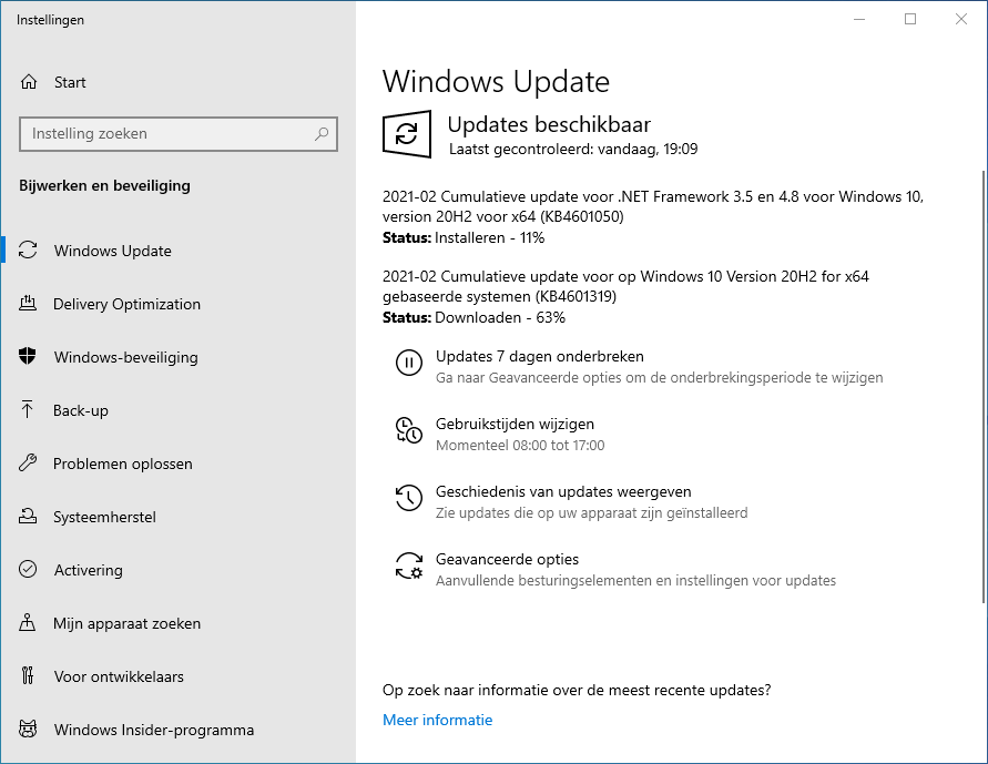 Versie Update Build Windows 10 20H2 KB4601319 19042.804 Windows 10 2004 KB4601319 19041.804 Windows 10 1909 KB4601315 18363.1377 Windows 8.1 KB4601384 - Versies 20H2 & 2004 krijgen dezelfde updates met hetzelfde KB-nummer omdat ze grotendeels identiek zijn. De maandelijkse beveiligingsupdates worden elke tweede dinsdag van de maand uitgebracht voor Windows 10 en 8.1 op de zogeheten 'pleisterdinsdag' of 'patch tuesday' van Microsoft. Deze updates worden automatisch geïnstalleerd.
