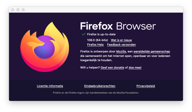 Firefox 106 is een update die te downloaden is voor Windows, macOS, Linux, Android en iOS. In de komende dagen wordt je browser automatisch bijgewerkt. Je kunt ook zelf updaten onder het driestreepjes-menu | Help | Over Firefox.