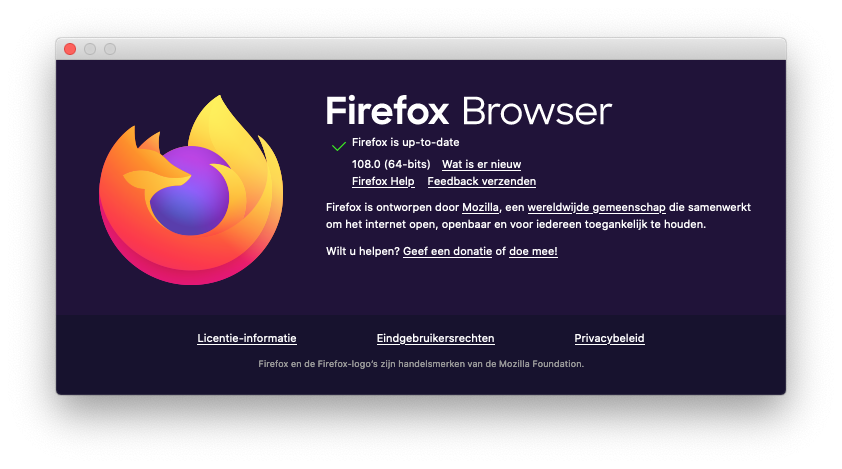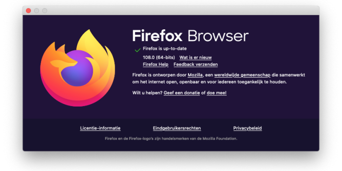 Firefox 108 is een update die te downloaden is voor Windows, macOS, Linux, Android en iOS. In de komende dagen wordt je browser automatisch bijgewerkt. Je kunt ook zelf updaten onder het driestreepjes-menu | Help | Over Firefox.