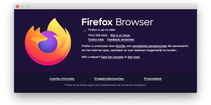 Firefox 110 is een update die te downloaden is voor Windows, macOS, Linux, Android en iOS. In de komende dagen wordt je browser automatisch bijgewerkt. Je kunt ook zelf updaten onder het driestreepjes-menu | Help | Over Firefox.