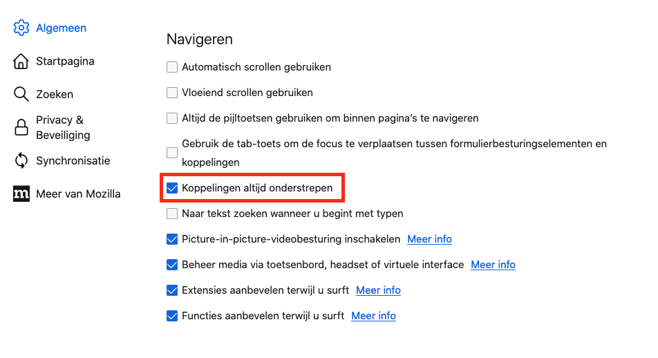 Verder heeft Firefox nu de optie onder Instellingen | Algemeen - Navigatie om linkjes (koppelingen) op websites standaard onderstreept te hebben. Op GratisSoftware.nl - en veel andere websites - worden linkjes alleen onderstreept als je met je muisaanwijzer erover heen gaat. Als je dat vervelend vindt en ze voor de duidelijkheid liever altijd onderstreept hebt dan kun je de optie 'Koppelingen altijd onderstrepen' aanzetten in Firefox.