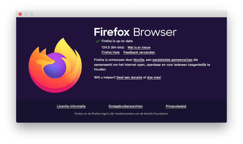 Firefox 124 is een update die te downloaden is voor Windows, macOS, Linux, Android en iOS. In de komende dagen wordt je browser automatisch bijgewerkt. Je kunt ook zelf updaten onder het driestreepjes-menu | Help | Over Firefox.