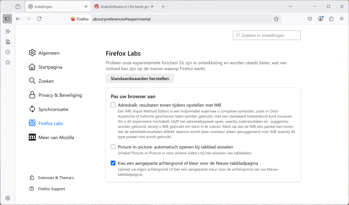 Dit kun je op de nieuw tabblad-pagina instellen via het tandwiel rechtsonder. Als deze functie van gepersonaliseerde achtergronden nog niet zichtbaar (want deze wordt geleidelijk uitgerold) dan kun je deze alvast aanzetten via Instellingen | Firefox Labs.