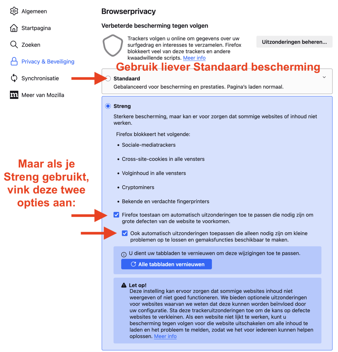 Voor de meeste gebruikers is het niet aan te raden om de strenge modus te gebruiken (standaard is voor de meesten voldoende), maar als je Verbeterde bescherming tegen volgen wel op Streng hebt staan dan adviseren we je om de twee vinkjes te zetten bij de automatische uitzonderingen. Dit zou moeten voorkomen dat websites niet goed functioneren door deze tracking protection.