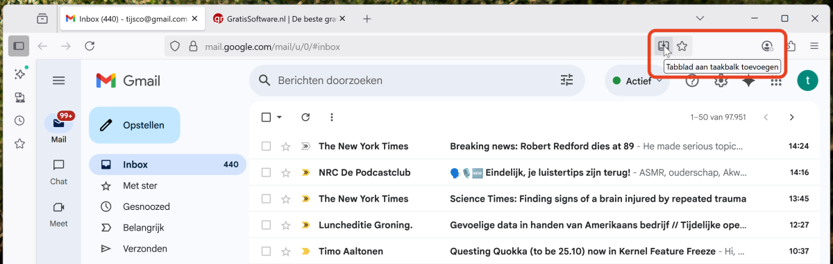 Web apps zijn bijvoorbeeld handig voor je webmail, zodat je je Gmail- of Outlook-mail aan de taakbalk kunt vastpinnen zonder een extra app te hoeven installeren. Ook kun je YouTube, Facebook, Instagram, Reddit, TikTok, LinkedIn, GratisSoftware.nl, Nu.nl, Teletekst of je andere favoriete websites zo snel als web app met hun eigen icoontje aan de taakbalk in Windows vastmaken. Voordeel: je opent snel je favoriete website, die met een herkenbaar icoontje op de taakbalk in Windows staat, zonder extra software te hoeven installeren!