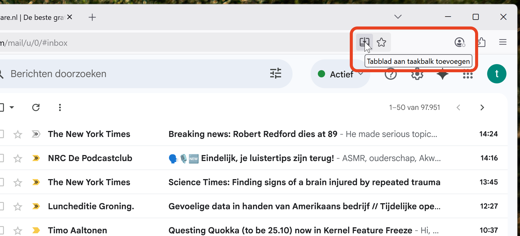 Je kunt een web app van een website aan de Windows taakbalk vastmaken door op het icoontje aan het einde van de adresbalk te klikken (rood omcirkeld in de afbeelding):