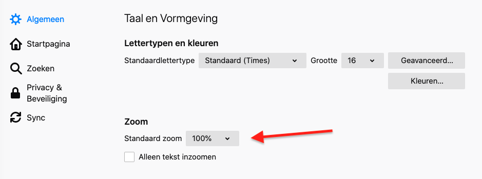 Nu is het mogelijk om in één keer een standaard zoomniveau in te stellen voor alle websites die je bezoekt. Ga naar Instellingen (Voorkeuren) | Algemeen - Taal en vormgeving en kies achter Zoom - Standaard zoom de gewenste vergroting die je wilt. Ook kun je alleen tekst inzoomen.