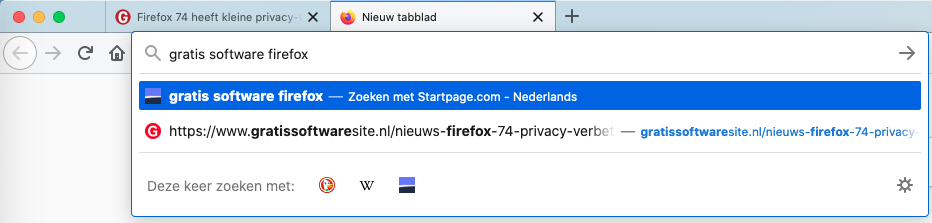 Voornaamste vernieuwing in Firefox 75 is de verbeterde zoekbalk. De zoekbalk in Firefox is geïntegreerd in de adresbalk, waar je adressen van websites intypt (maar je kunt ook kiezen voor een losse zoekbalk onder Instellingen | Zoeken | Zoekbalk - Zoekbalk toevoegen in werkbalk).