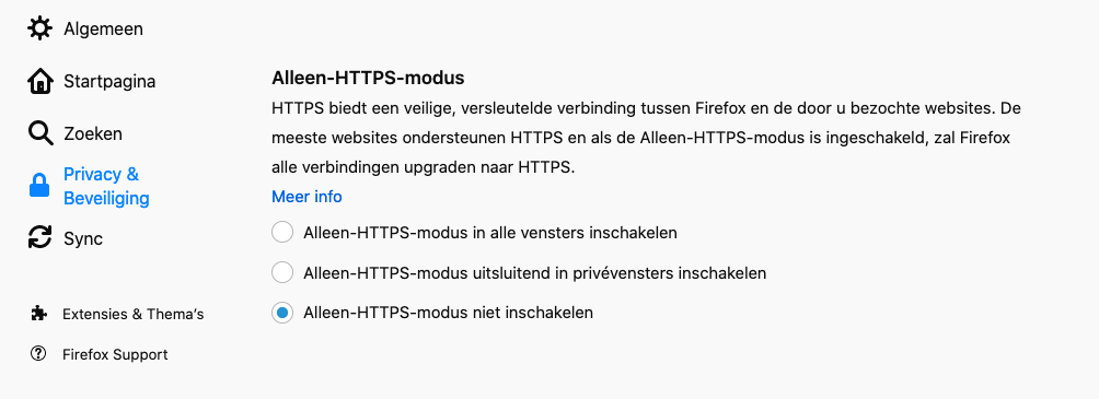 Als je wilt kun je onder Privacy & Beveiliging onderaan de Alleen-HTTPS-modus inschakelen