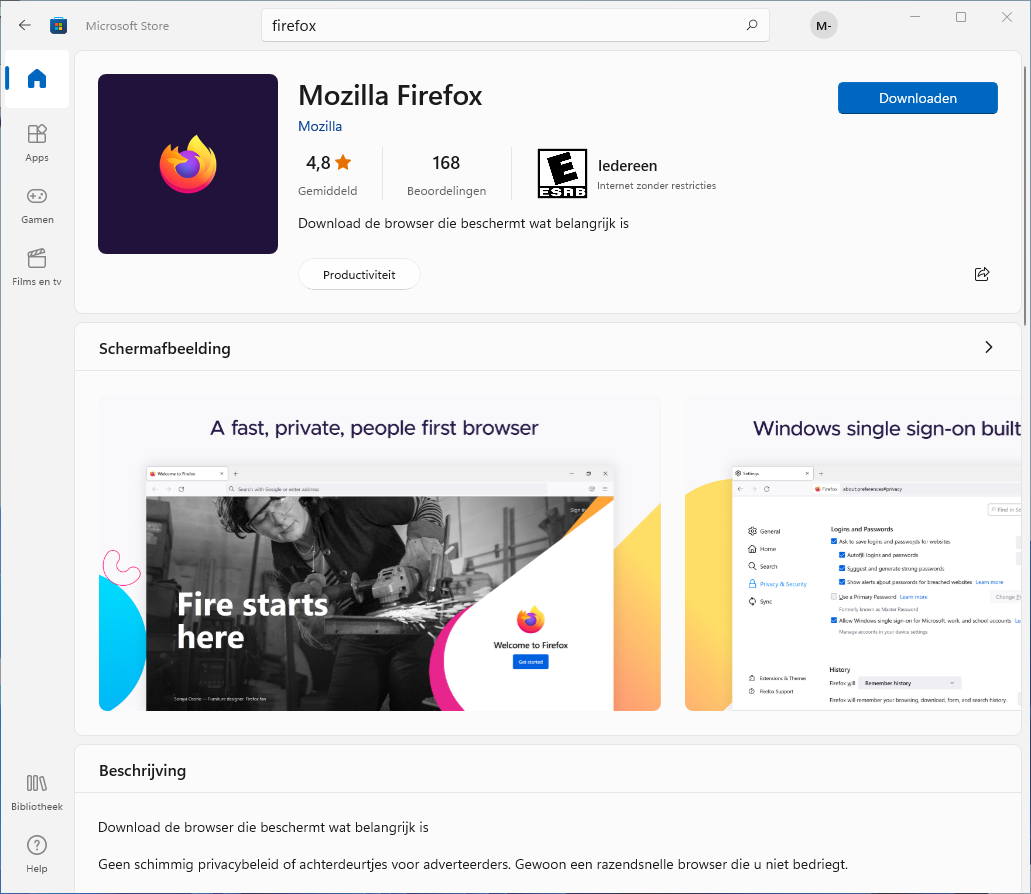 Firefox 95 is voor het eerst ook officieel in de Microsoft Store van Windows 10 en 11 te downloaden (eigenlijk al enkele weken, maar Mozilla kondigt het nu aan). Wij hebben geen voordelen gezien boven de download van de website van Mozilla. Integendeel want de desktop-app kun je wel met 1 klik als je standaard browser instellen en de Store app van Firefox moet je op de omslachtige wijze van Microsoft als standaard instellen. Maar voor wie dat prefereert kun je nu ook naar Microsoft Store gaan en zoeken op 'Firefox' of deze downloadlink voor Firefox in de Microsoft Store gebruiken.