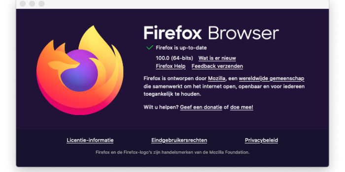 Firefox 100 is een update die te downloaden is voor Windows, macOS, Linux, Android en iOS. In de komende dagen wordt je browser automatisch bijgewerkt. Je kunt ook zelf updaten onder het driestreepjes-menu | Help | Over Firefox.