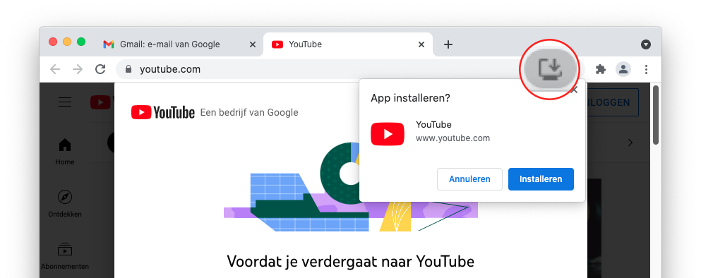 Ook zijn enkele nieuwe functies toegevoegd. Zo kan Chrome 93 nu linkjes van bepaalde websites in de PWA (progressive web app) openen als je die geïnstalleerd hebt in Chrome. Zo kun je bijvoorbeeld filmpjes rechtstreeks openen in de PWA van YouTube. Als websites PWA's hebben (die sneller en beter in een los venster van Chrome werken) dan zie je dat aan dit icoontje in de adresbalk waarmee je de PWA kunt installeren: