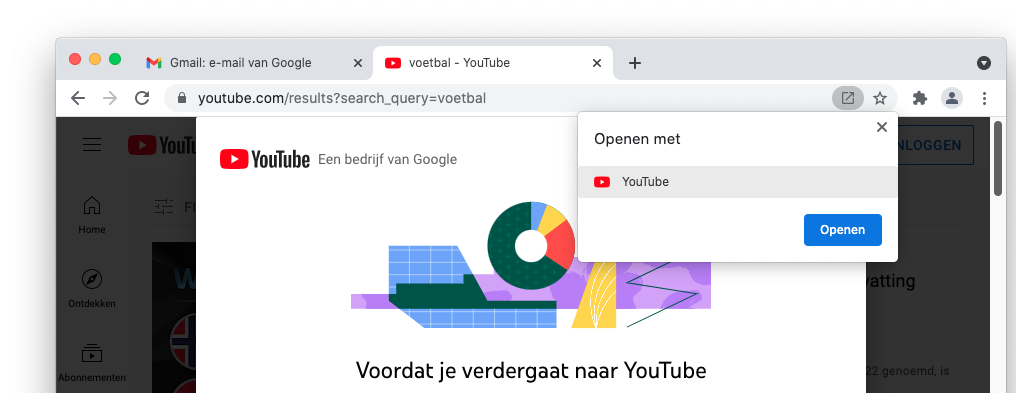 Nu zou een YouTube-linkje direct in een PWA-venster van YouTube moeten openen als je erop klikt in je mail bijvoorbeeld (dit heet PWA als url-handler).