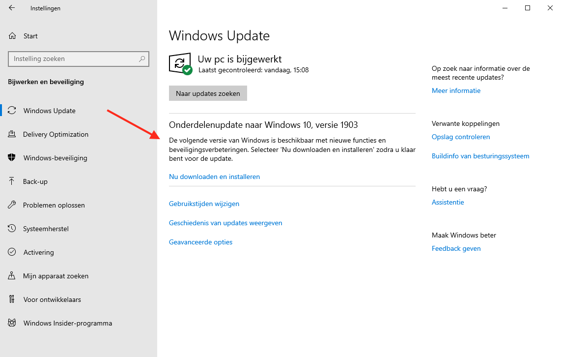 Jawel, via Windows update versie 1903 binnengehaald. Twee installeer pogingen gedaan. Heeft vrij lang geduurd allemaal. Maar nu geen problemen gevonden tot nu toe.