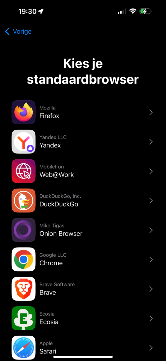 De keuze is dan in Nederland, in willekeurige volgorde, tussen Safari, Firefox, Chrome, Edge, Brave, Opera, DuckDuckGo, Ecosia, Onion Browser, Yandex Browser, Web@Work en Aloha. Je kunt de standaard browser altijd weer wijzigen onder Instellingen | Safari - Standaardbrowserapp (of in de Instellingen van je eigen web browser).