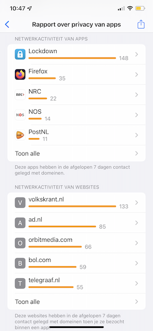 Zo kun je heel nauwkeurig zien wat apps allemaal doen op je telefoon of tablet en of ze veel contact met diverse domeinen voor bijvoorbeeld tracking hebben. Voor gevorderde gebruikers die meer controle en zicht willen hebben wat er op hun i-apparaat gebeurt is het privacy-rapport een mooie toevoeging van Apple.