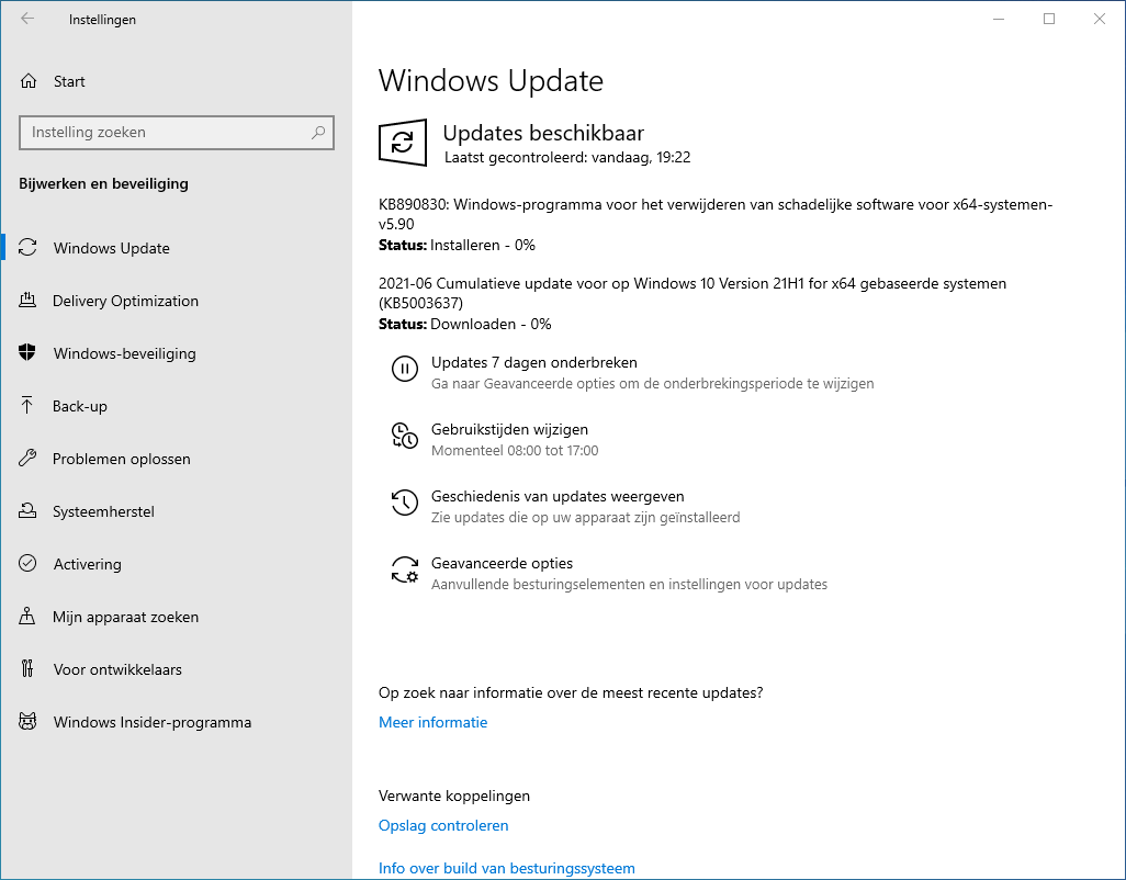 Versie Update Build Windows 10 21H1 KB5003637 19043.1052 Windows 10 20H2 KB5003637 19042.1052 Windows 10 2004 KB5003637 19041.1052 Windows 8.1 KB5003671 - Versies 21H1, 20H2 & 2004 krijgen dezelfde updates met hetzelfde KB-nummer omdat ze grotendeels identiek zijn. De maandelijkse beveiligingsupdates worden elke tweede dinsdag van de maand uitgebracht voor Windows 10 en 8.1. Deze updates worden automatisch geïnstalleerd.
