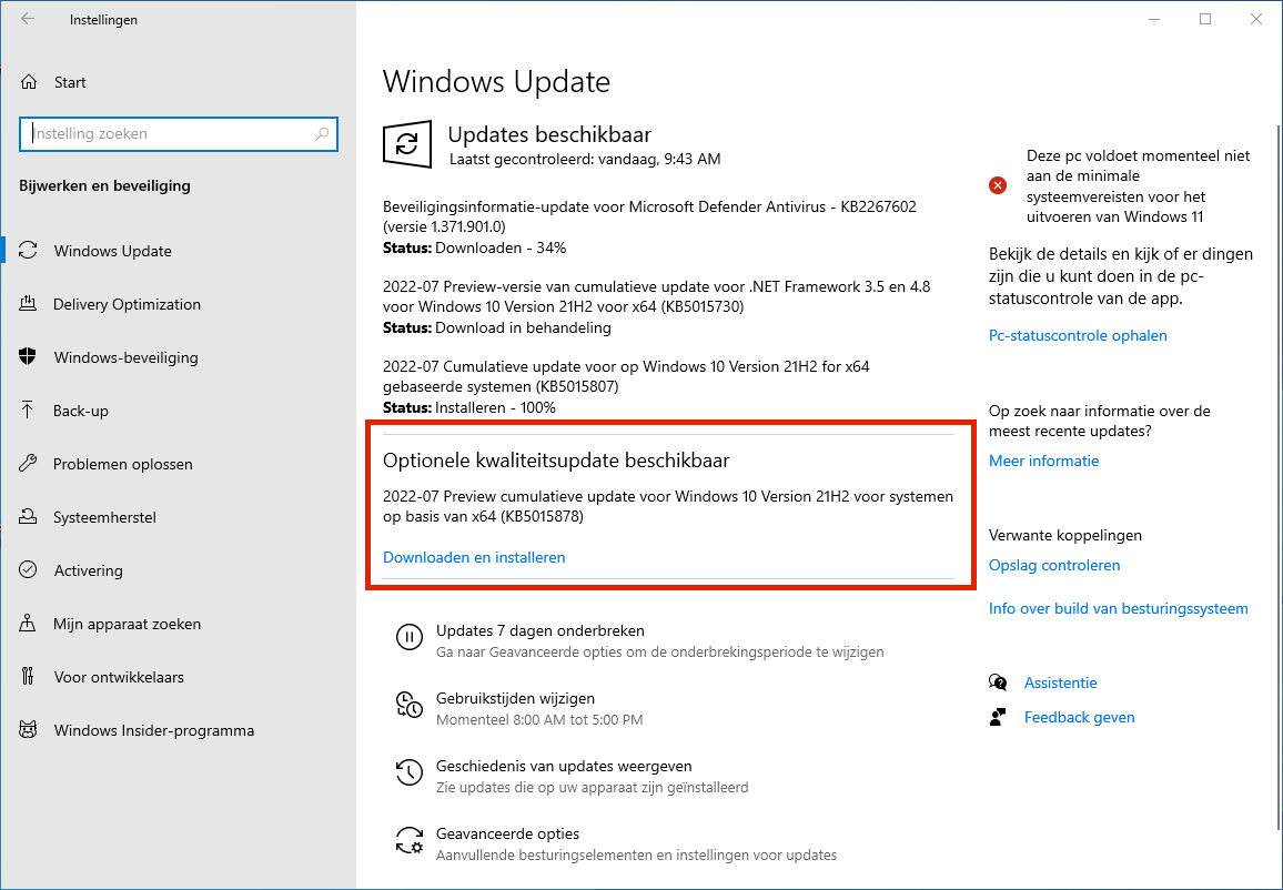 21 juli 2022 KB5015882 Windows 11 22000.832 26 juli 2022 KB5015878 Windows 10 21H2 19044.1865 Windows 10 21H1 19043.1865
