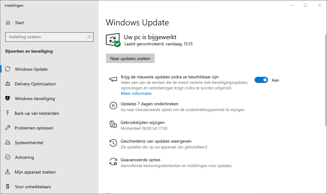 Verder kun je nu, net als in Windows 11, een schakelaar in Windows Update aanzetten om altijd als eerste nieuwe functies te krijgen. En nu Windows 10 ook daadwerkelijk weer nieuwe functionaliteit krijgt is dat een handige knop voor mensen die voorop willen lopen. Zet dan dus de schakelaar Aan: