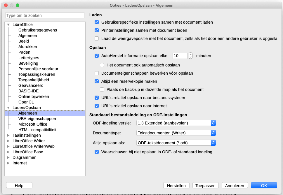 LibreOffice 24.2 heeft het maken van automatische backups standaard aanstaan. Elke tien minuten worden AutoHerstel informatie en reservekopieën opgeslagen, zodat je bij een eventuele crash niet de wijzigingen in een document kwijt bent.