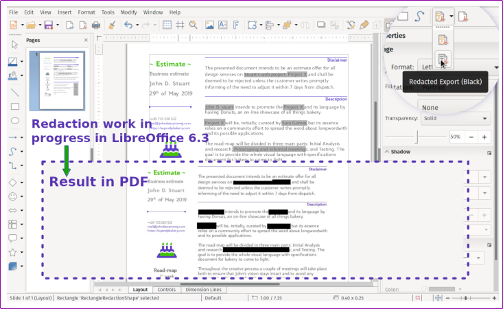 - Privacy-gevoelige informatie in documenten kan nu verborgen worden onder zwarte blokken als je een document exporteert als pdf. Kies hiervoor Extra | Redigeren en dan in de Redigeren tool kun je een rechthoek of vrije vorm kiezen om tekst grijs te maken. Als je daarna exporteert als pdf worden dit zwarte blokken in het uiteindelijke document
