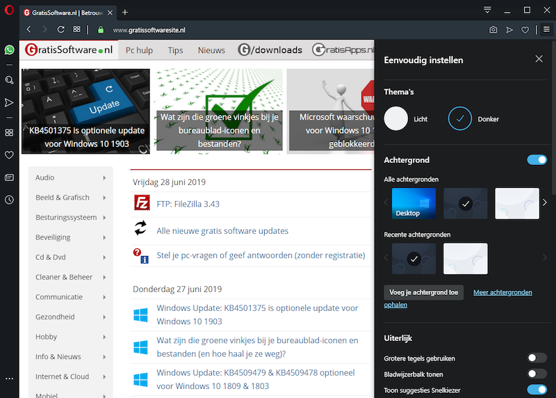 Meest in het oog springende verandering is het donkere thema. Dit kun je aanzetten door bij Eenvoudig instellen (schuifjes rechtsboven) te kiezen voor Thema's | Donker. In Windows 10 volgt Opera 62 ook het donkere thema van Windows als je dat instelt.